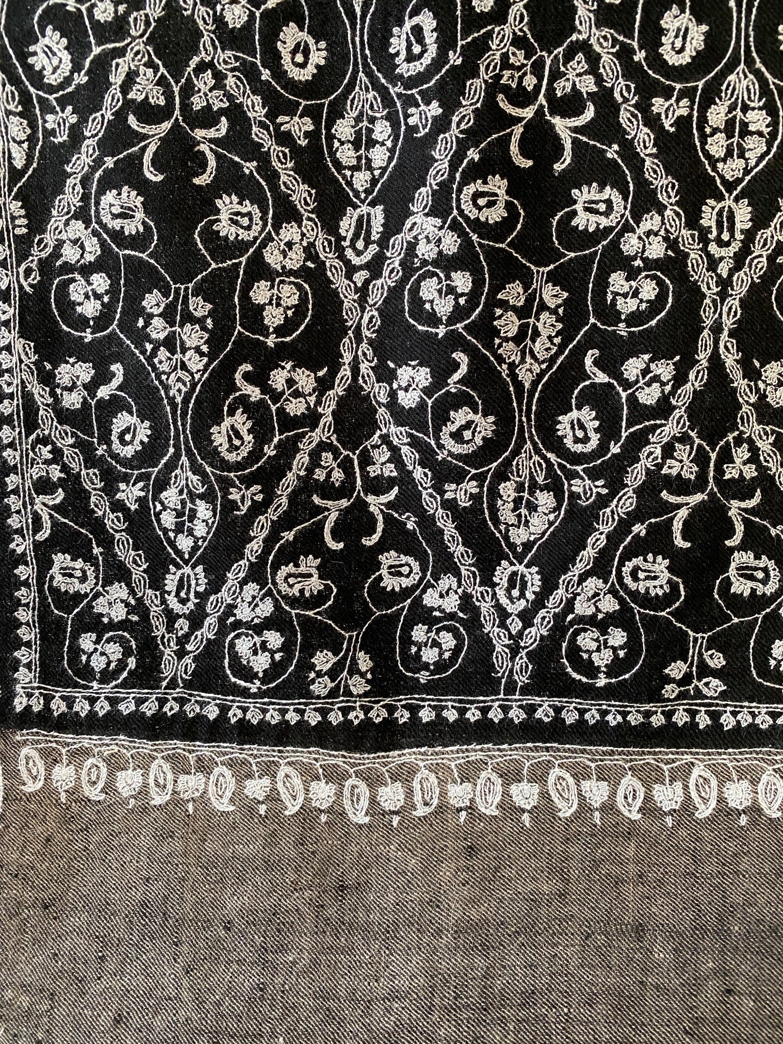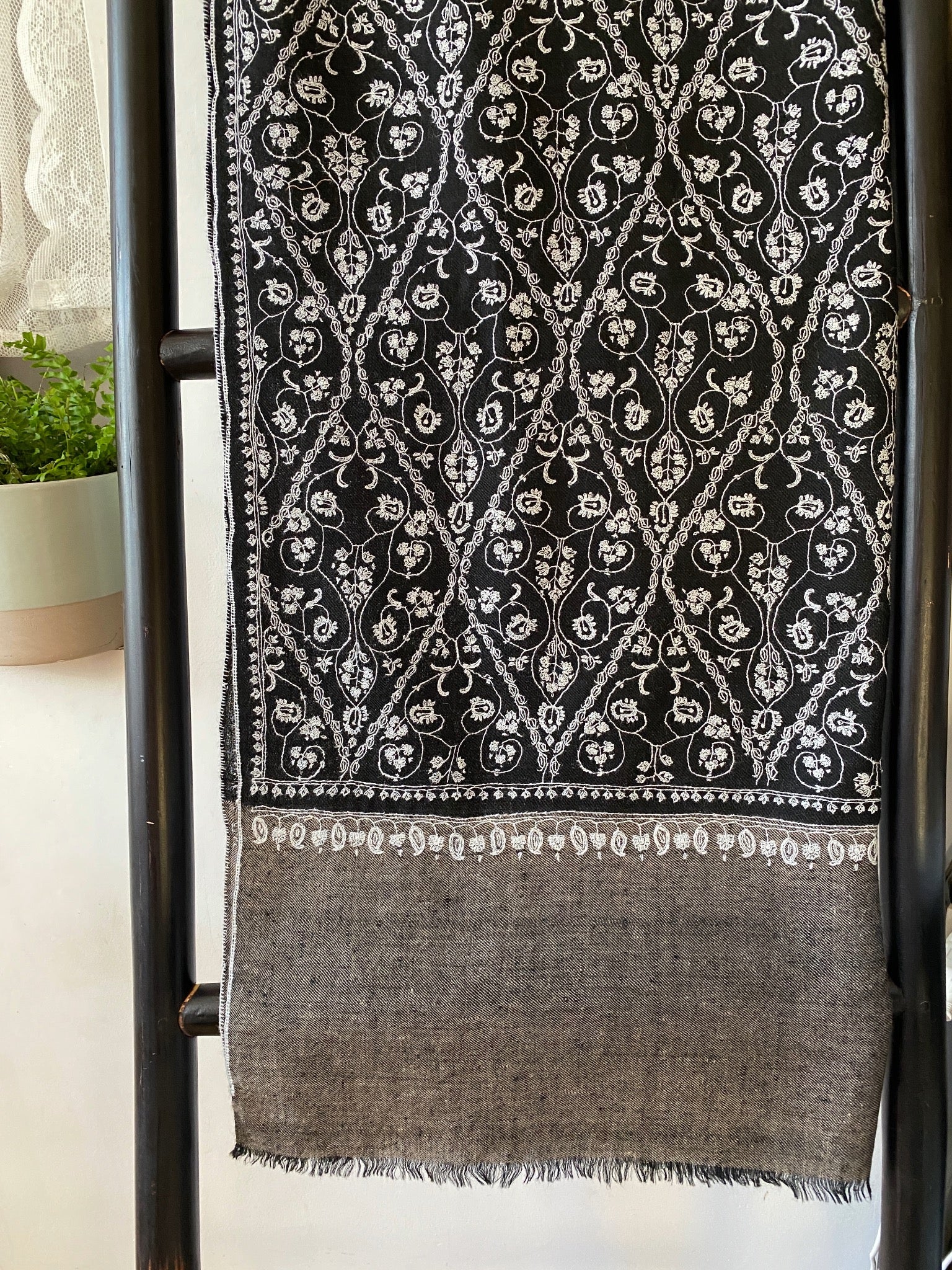 Black with Grey Bottom with White Full Hand Embroidery Pashmina