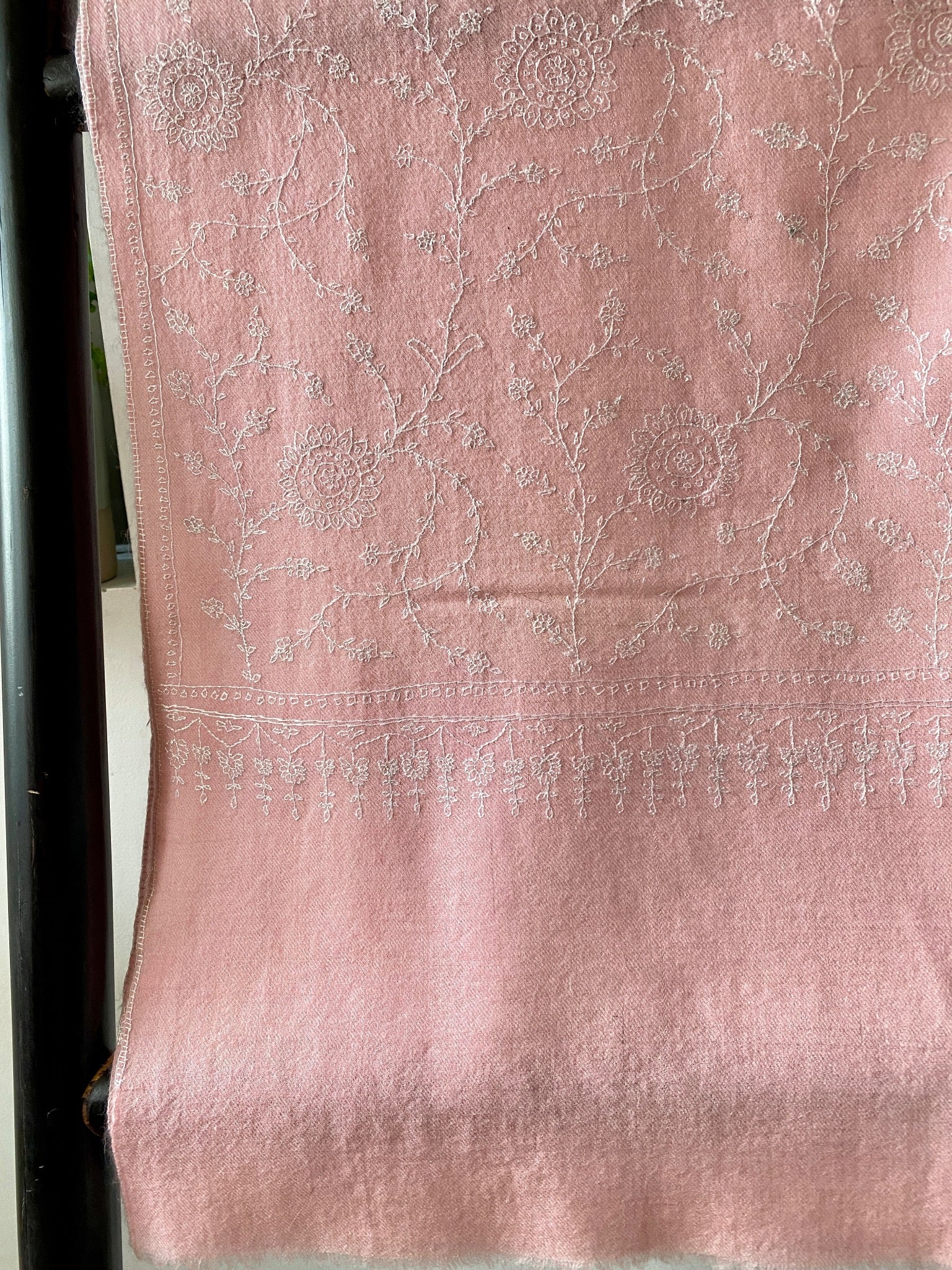Pure Pashmina (cashmere) offers a luxurious feel and timeless beauty. Made 100% from premium cashmere, this natural-coloured wrap is soft, warm and exquisitely embroidered. Perfect for dressing up any outfit, this piece will add a cozy elegance to any wardrobe.