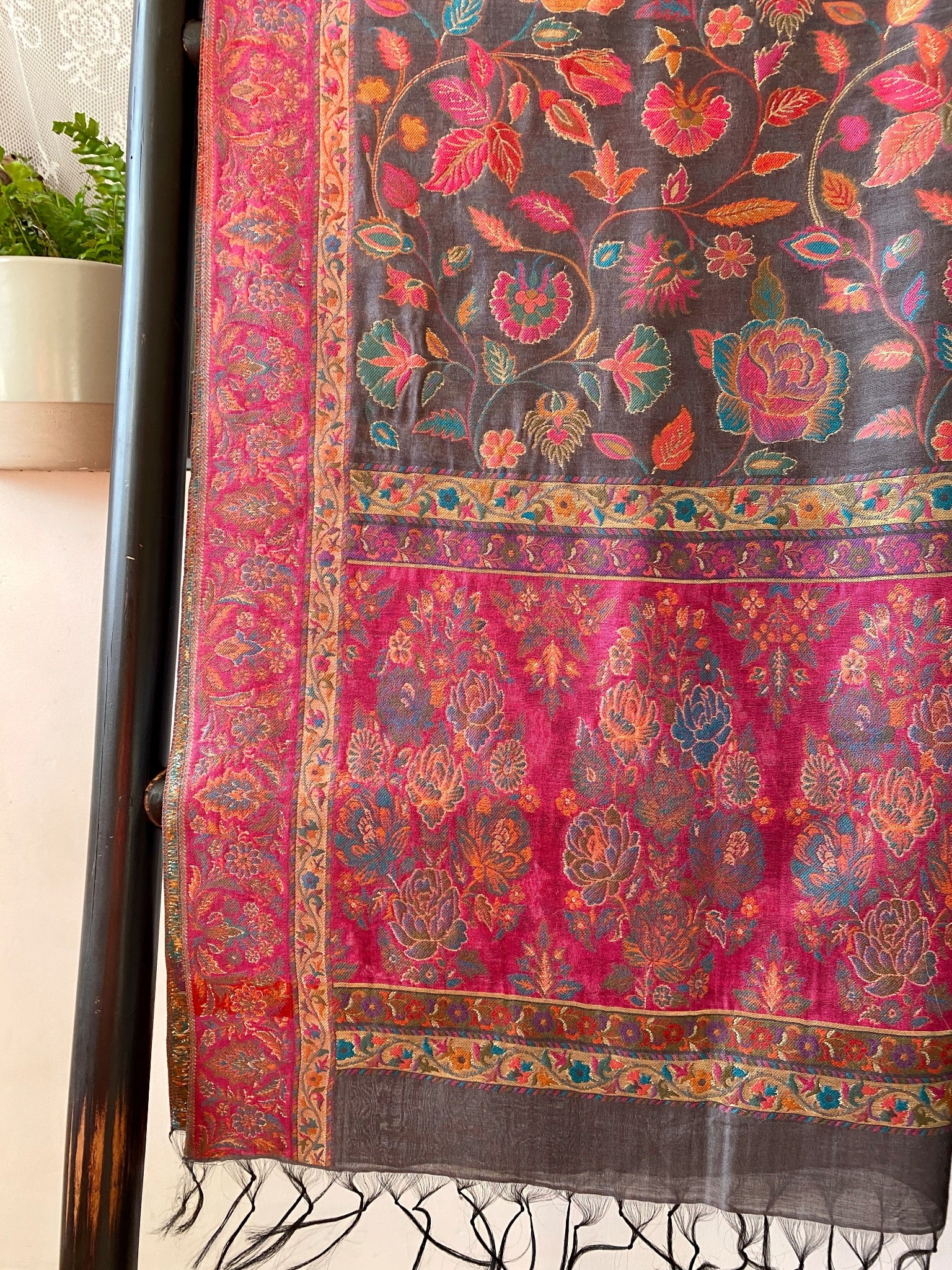 Handmade Kani Silk Dark Grey with Dark Shocking Pink with Flower Pattern Shawl from Kashmir