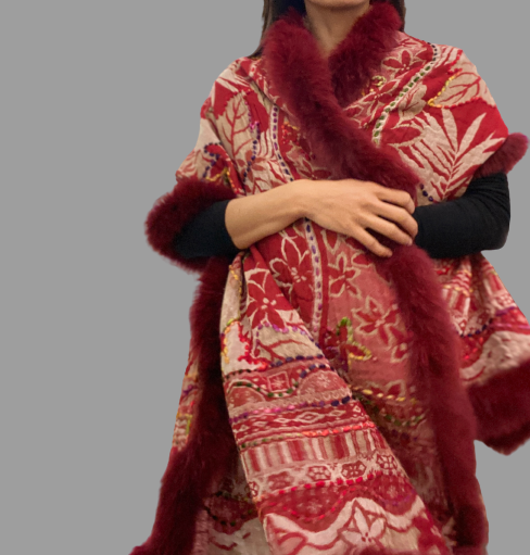 Red colour handcrafted boiled wool embroidery scarf in four side