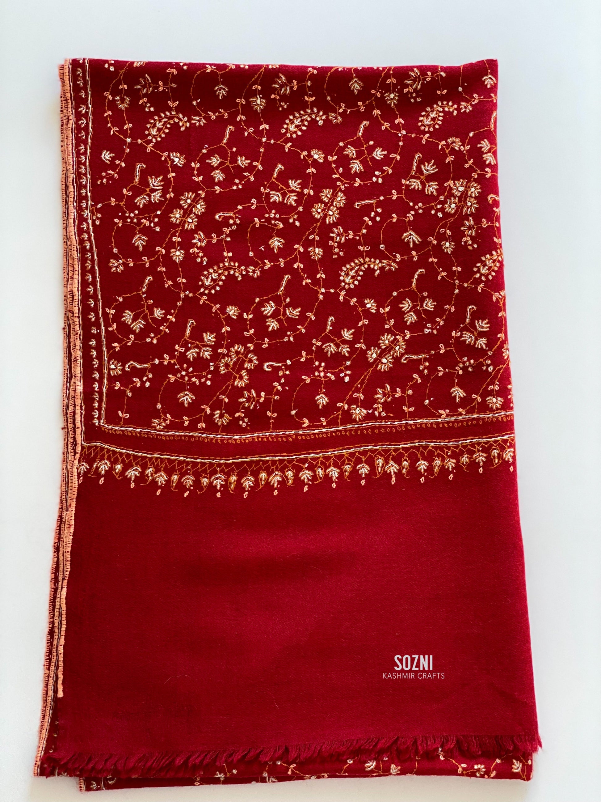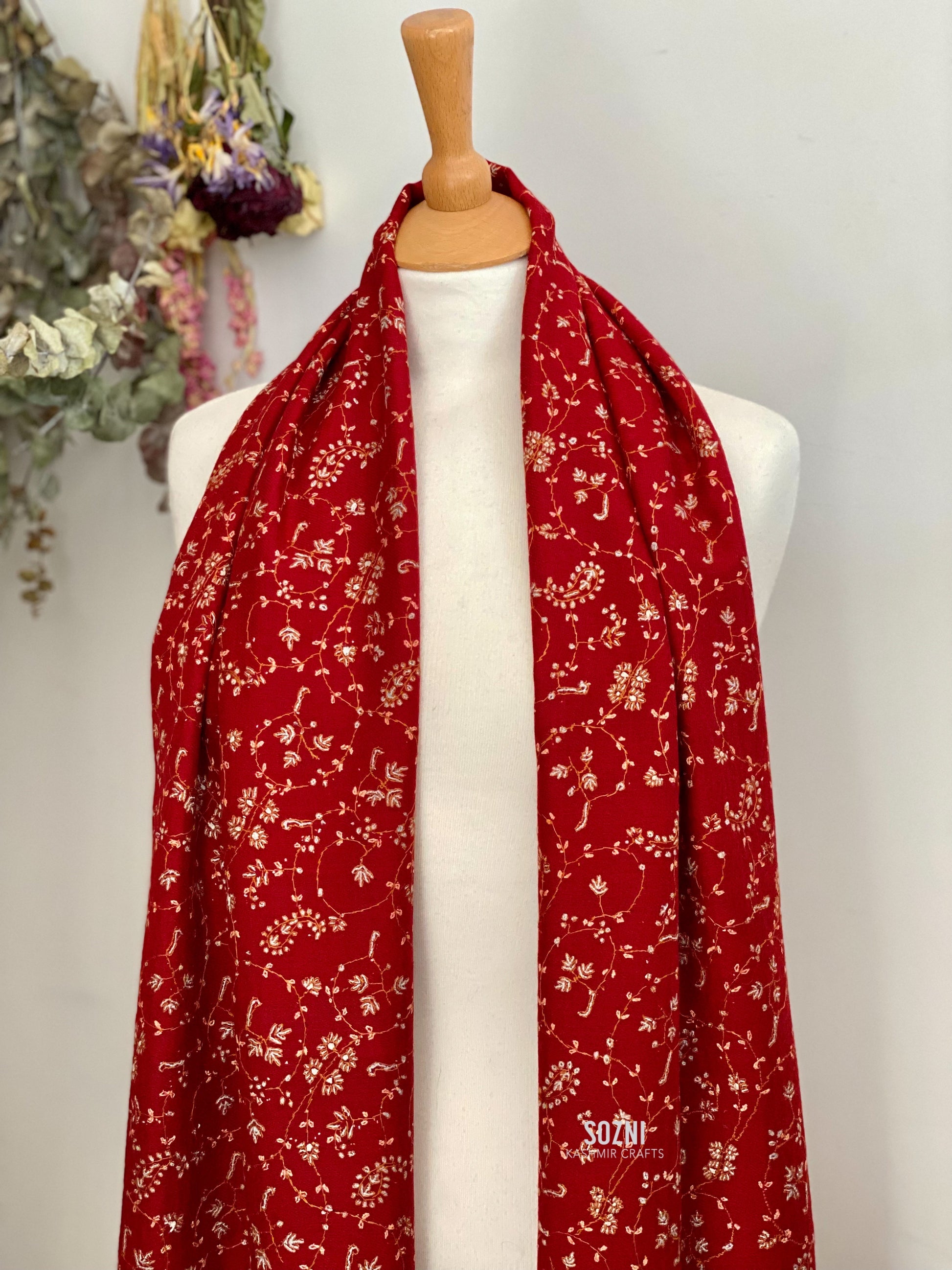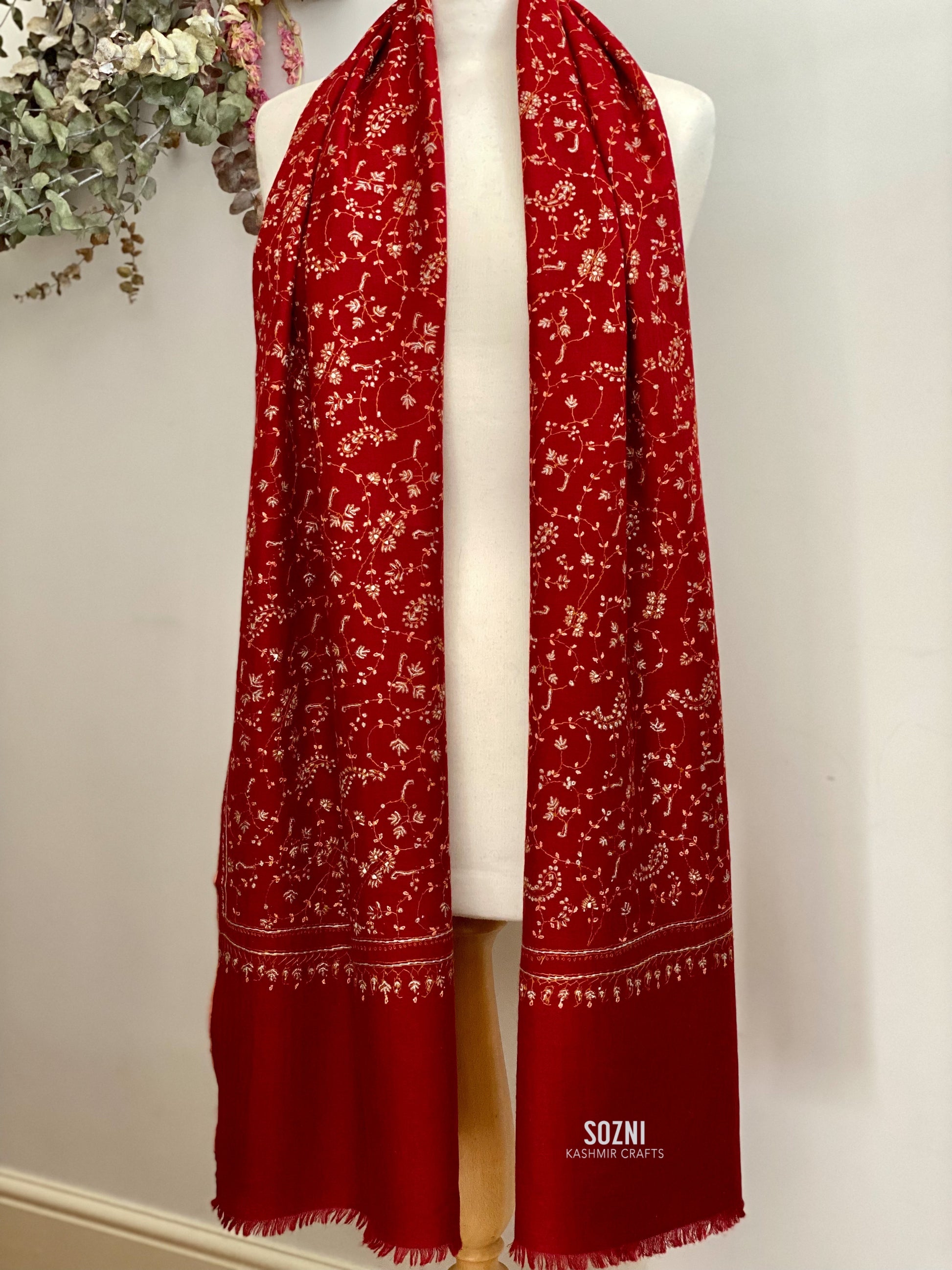 Handmade Christmas Red with Blue Flower Wool Embroidery (Jali) Stole