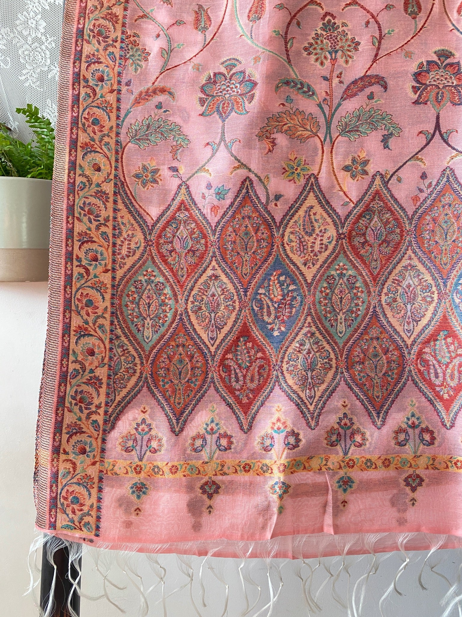 Handmade Kani Silk Saree Soft Pink Colour Base Wth Diamond Pattern Bottom Shawl from Kashmir